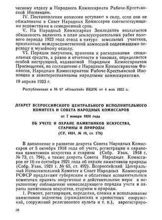Декрет Всероссийского Центрального Исполнительного Комитета и Совета Народных Комиссаров от 7 января 1924 года. Об учете и охране памятников искусства, старины и природы // Распубликован в № 43 «Известий» ЦИК и ВЦИК от 21 февраля 1924 г.