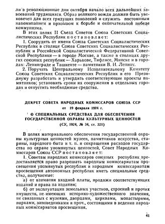 Декрет Совета Народных Комиссаров Союза ССР от 19 февраля 1924 г. О специальных средствах для обеспечения государственной охраны культурных ценностей