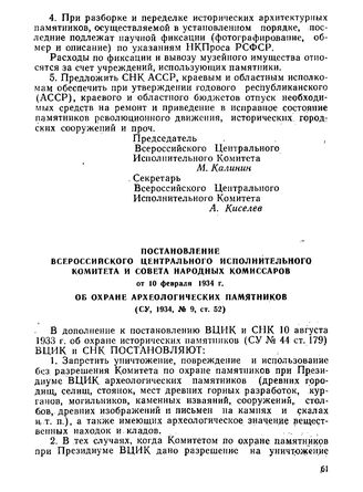 Постановление Всероссийского Центрального Исполнительного Комитета и Совета Народных Комиссаров от 10 февраля 1934 г. Об охране археологических памятников // СУ, 1934, № 9, ст. 52.