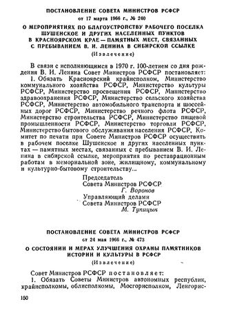 Постановление Совета Министров РСФСР от 17 марта 1966 г., № 240. О мероприятиях по благоустройству рабочего поселка Шушенское и других населенных пунктов в Красноярском крае - памятных мест, связанных с пребыванием В. И. Ленина в сибирской ссылке. (Извлечение)