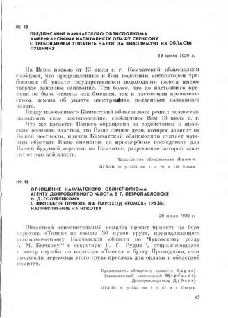Предписание Камчатского облисполкома американскому капиталисту Олафу Свенсону с требованием уплатить налог за вывозимую из области пушнину. 14 июля 1920 г. // ЦГАДВ. ф. р.-1378. oп. 1. д. 20. л. 118. Копия.