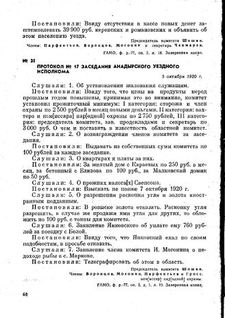 Протокол № 17 заседания Анадырского уездного исполкома. 5 октября 1920 г. // ГАМО, ф. р.-77, оп. 2, д. 1, л. 19. Заверенная копия.