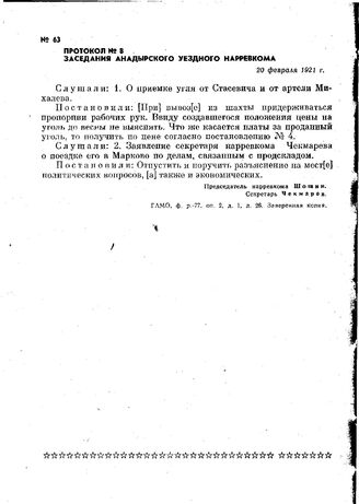 Протокол № 8 заседания Анадырского уездного нарревкома. 20 февраля 1921 г. // ГАМО. ф. р.-77, оп. 2, д. 1, л. 26. Заверенная копия.