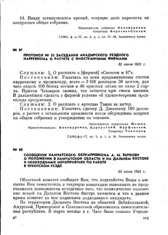 Сообщение Камчатского облнарревкома А. М. Бычкову о положении в Камчатской области и на Дальнем Востоке и необходима мероприятиях по работе в Чукотском уезде. 22 июля 1921 г. // ЦГАДВ. ф. р.-1382, oп. 1, д. 68, лл. 6-7. Отпуск.