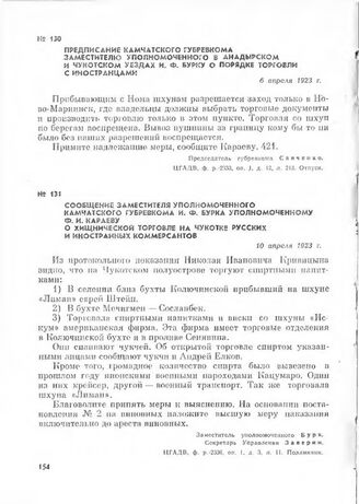Предписание Камчатского губревкома заместителю уполномоченного в Анадырском и Чукотском уездах И. Ф. Бурку о порядке торговли с иностранцами. 6 апреля 1923 г. // ЦГАДВ. ф. p.-23ЗЗ. oп. 1, д. 12. л. 213. Отпуск.