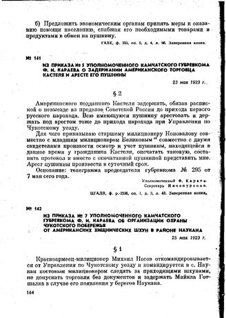Из приказа № 5 уполномоченного Камчатского губревкома Ф. И. Караева о задержании американского торговца Кастеля и аресте его пушнины. 23 мая 1923 г. // ЦГАДВ. ф. р.-2336, oп, 1, д, 3, л. 43. Заверенная копия.