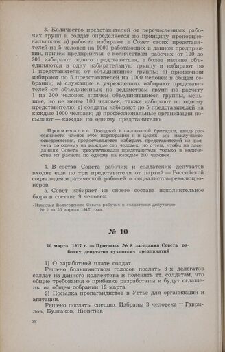 10 марта 1917 г. — Протокол № 8 заседания Совета рабочих депутатов сухонских предприятий // ВОГА, ф. 105 с, oп. 1, д. 1, л. 10 и об. Подлинник.