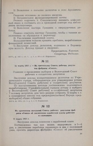 Из протоколов заседаний Совета рабочих депутатов фабрики «Сокол» об увеличении заработной платы рабочим и служащим. 11 марта 1917 г. // ВОГА, ф. 105с, oп. 1, д. 2, лл. 8—10. Подлинник.