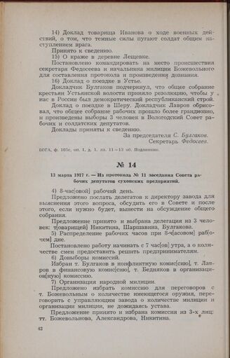 13 марта 1917 г. — Из протокола № 11 заседания Совета рабочих депутатов сухонских предприятий // ВОГА, ф. 105с, oп. 1, д. 1, лл. 13—14. Подлинник.
