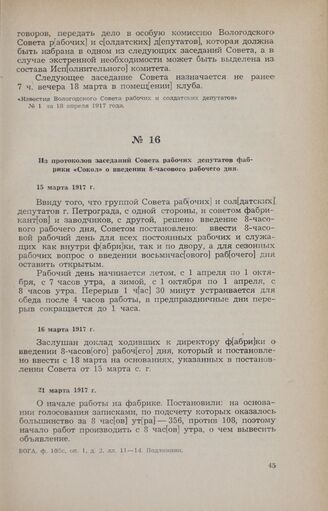 Из протоколов заседаний Совета рабочих депутатов фабрики «Сокол» о введении 8-часового рабочего дня. 15 марта 1917 г. // ВОГА. ф. 105с, oп. 1, д. 2, лл. 11 — 14. Подлинник.