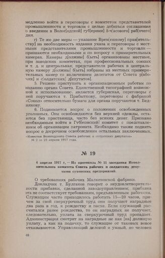 4 апреля 1917 г. — Из протокола № 11 заседания Исполнительного комитета Совета рабочих и солдатских депутатов сухонских предприятий // ВОГА, ф. 105с, oп. 1, д. 1, лл. 54 об.—55 об. Подлинник.