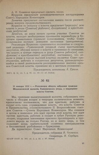 15 января 1918 г. — Резолюция общего собрания граждан Жерноковской волости, Грязовецкого уезда, о поддержке власти Советов // ЦГАОР СССР, ф. 393, оп. 2, д. 32, л. 97. Копия.