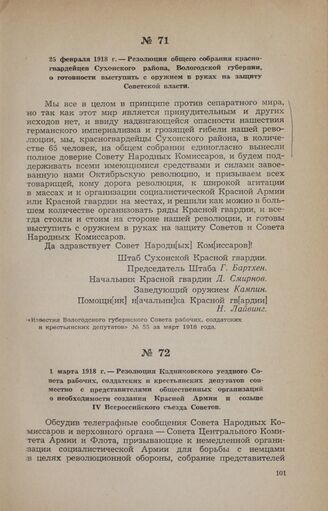 1 марта 1918 г. — Резолюция Кадниковского уездного Совета рабочих, солдатских и крестьянских депутатов совместно с представителями общественных организаций о необходимости создания Красной Армии и созыве IV Всероссийского съезда Советов
