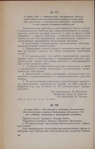 25 марта 1918 г. — Обязательное постановление Вологодского губернского исполнительного комитета Совета рабочих, солдатских и крестьянских депутатов о вступлении в силу декрета о 8-часовом рабочем дне // ВОГА, ф. 276 р, oп. 1, д. 5, л. 26. Копия.