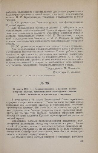 31 марта 1918 г. — Корреспонденция о военном параде в городе Вологде, организованном Вологодским Советом рабочих, солдатских и крестьянских депутатов // «Известия Вологодского губернского Совета рабочих, солдатских и крестьянских депутатов» № 68 за 3 апреля 1918 года.