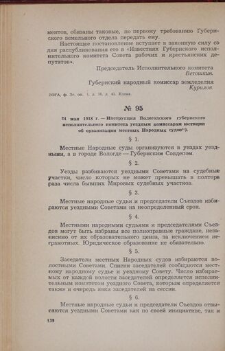 24 мая 1918 г. — Инструкция Вологодского губернского исполнительного комитета уездным комиссарам юстиции об организации местных Народных судов // ВОГА, ф. 3с, оп. 1, д. 18, л. 61 и об. Подлинник.