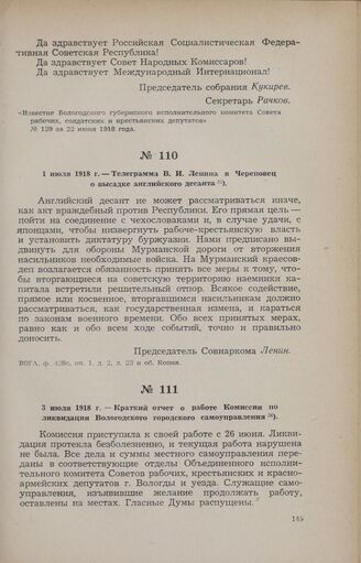 1 июля 1918 г. — Телеграмма В. И. Ленина в Череповец о высадке англ...