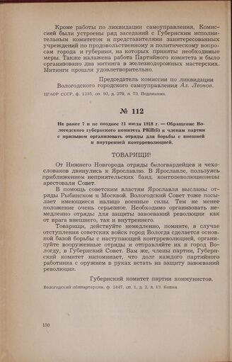 Не ранее 7 и не позднее 21 июля 1918 г. — Обращение Вологодского губернского комитета РКП(б) к членам партии с призывом организовать отряды для борьбы с внешней и внутренней контрреволюцией
