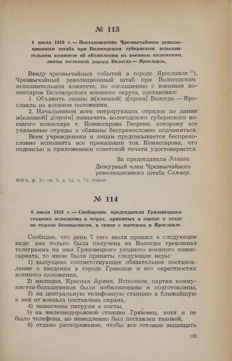 8 июля 1918 г. — Постановление Чрезвычайного революционного штаба при Вологодском губернском исполнительном комитете об объявлении на военном положении, линии железной дороги Вологда — Ярославль // ВОГА, ф. 3с, oп. 1, д. 22, л. 72. Копия.