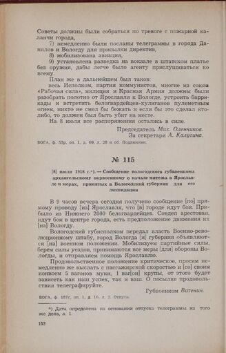 [8] июля 1918 г. — Сообщение вологодского губвоенкома архангельскому окрвоенкому о начале мятежа в Ярославле и мерах, принятых в Вологодской губернии для его ликвидации // ВОГА, ф. 187с, oп. 1, д. 10, л. 2. Отпуск.