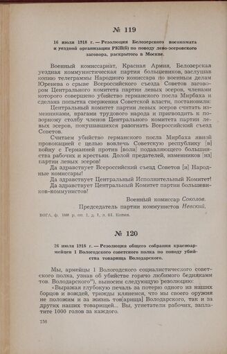 16 июля 1918 г. — Резолюция Белозерского военкомата и уездной организации РКП(б) по поводу лево-эсеровского заговора, раскрытого в Москве // ВОГА, ф. 1888 р, oп. 1, д. 1, л. 61. Копия.