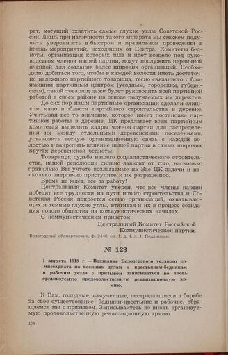 1 августа 1918 г. — Воззвание Белозерского уездного комиссариата по военным делам к крестьянам-беднякам и рабочим уезда с призывом записываться во вновь организуемую продовольственную реквизиционную армию