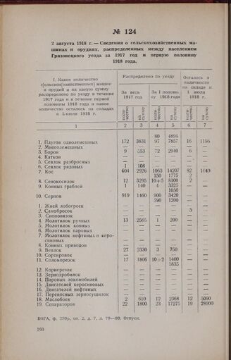 2 августа 1918 г. — Сведения о сельскохозяйственных машинах и орудиях, распределенных между населением Грязовецкого уезда за 1917 год и первую половину 1918 года
