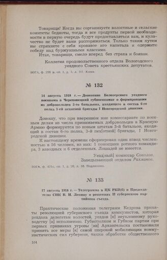 17 августа 1918 г. — Телеграмма в ЦК РКП(б) и Председателю СНК В. И. Ленину о решениях II губернского партийного съезда // ЦГАОР СССР, ф. 1235, оп. 93, д. 279, л. 19. Копия.