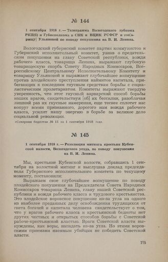 1 сентября 1918 г. — Телеграмма Вологодского губкома РКП(б) и Губисполкома в СНК и ВЦИК РСФСР и тов[арищу] Ульяновой по поводу покушения на В. И. Ленина
