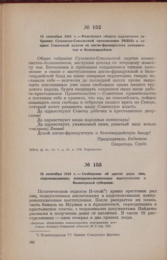 16 сентября 1918 г. — Резолюция общего партийного собрания Сухонско-Сокольской организации РКП(б) о защите Советской власти от англо-французских интервентов и белогвардейцев // ВОГА, ф. 3с, oп. 1, д. 21, л. 179. Подлинник.