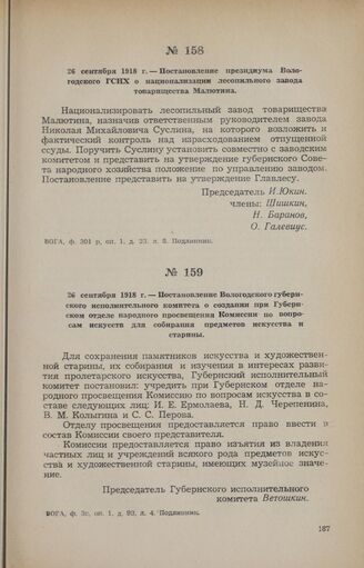 26 сентября 1918 г. — Постановление Вологодского губернского исполнительного комитета о создании при Губернском отделе народного просвещения Комиссии по вопросам искусств для собирания предметов искусства и старины // ВОГА, ф. 3с, oп. 1, д. 93, л. 4. Подлинник.