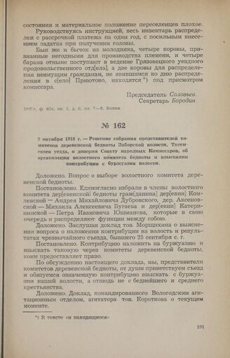 9 октября 1918 г. — Решение собрания представителей комитетов деревенской бедноты Заборской волости, Тотемского уезда, о доверии Совету народных Комиссаров, об организации волостного комитета бедноты и взыскании контрибуции с буржуазии волости
