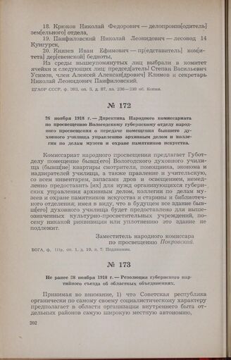 26 ноября 1918 г. — Директива Народного комиссариата по просвещению Вологодскому губернскому отделу народного просвещения о передаче помещения бывшего духовного училища управлению архивным делом и Коллегии по делам музеев и охране памятников искус...