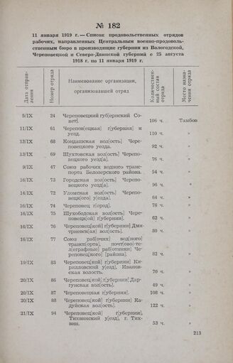 11 января 1919 г. — Список продовольственных отрядов рабочих, направленных Центральным военно-продовольственным бюро в производящие губернии из Вологодской, Череповецкой и Северо-Двинской губерний о 25 августа 1918 г. по 11 января 1919 г.
