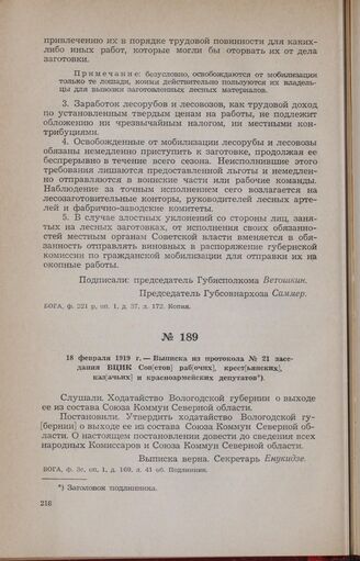 18 февраля 1919 г. — Выписка из протокола № 21 заседания ВЦИК Сов[е...