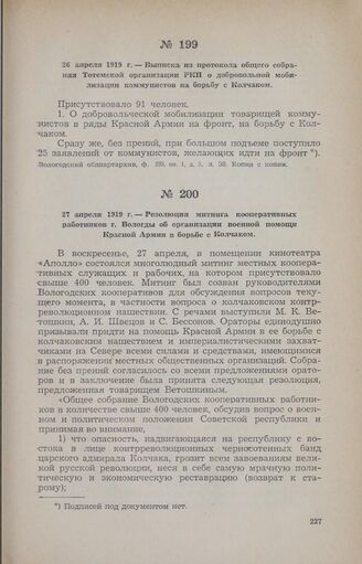26 апреля 1919 г. — Выписка из протокола общего собрания Тотемской организации РКП о добровольной мобилизации коммунистов на борьбу с Колчаком