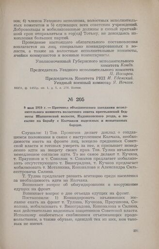 9 мая 1919 г. — Протокол объединенного заседания исполнительного комитета волостного совета крестьянской бедноты Шапшенской волости, Кадниковского уезда, о посылке на борьбу с Колчаком надежных и испытанных борцов // ВОГА, ф. 53р, oп. 1, д. 153, л. 63. Копия.