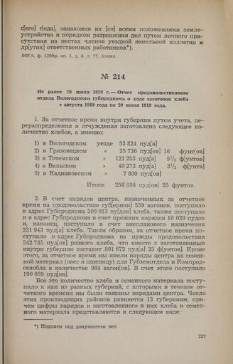 Не ранее 20 июня 1919 г. — Отчет продовольственного отдела Вологодского губпродкома о ходе заготовок хлеба с августа 1918 года по 20 июня 1919 года