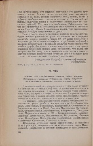 26 июня 1919 г. — Докладная записка отдела питания Вологодского упродкома Губернскому отделу общественного питания о состоянии детского питания в уезде // ВОГА, ф. 2358р, oп. 1, д. 23, л. 36. Подлинник.