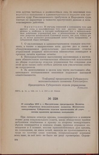 19 сентября 1919 г. — Предписание председателя Вологодского губернского исполнительного комитета Ветошкина заведующему Губернским отделом просвещения об улучшении хранения архивных материалов // ВОГА, ф. 3с, oп. 1, д. 190, лл. 402—403. Копия.