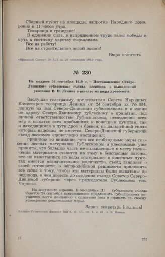 Не позднее 26 сентября 1919 г. — Постановление Северо-Двинского губернского съезда лескомов о выполнении указаний В. И. Ленина о выкате из воды древесины // Велико-Устюгский филиал ВОГА, ф. 43, oп. 1, д. 61, л. 9. Копия.