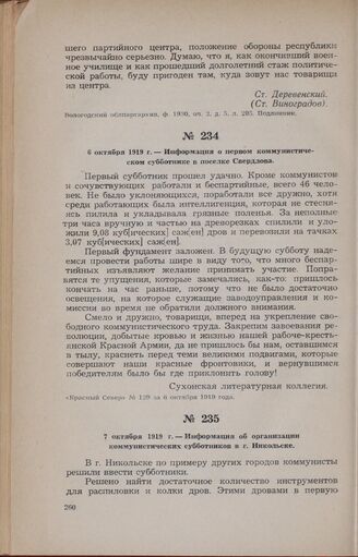 6 октября 1919 г. — Информация о первом коммунистическом субботнике в поселке Свердлова // «Красный Север» № 129 за 6 октября 1919 года.
