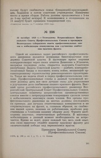 16 октября 1919 г. — Телеграмма Всероссийского Центрального Совета Профессиональных Союзов в президиум Вологодского губернского совета профессиональных союзов о мобилизации коммунистов для улучшения снабжения красного фронта
