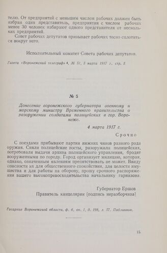 Донесение воронежского губернатора военному и морскому министру Временного правительства о разоружении солдатами полицейских в гор. Воронеже. 4 марта 1917 г.