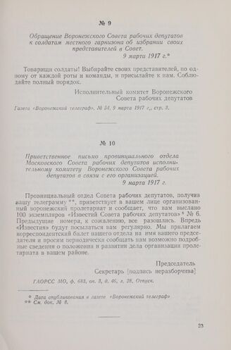 Приветственное письмо провинциального отдела Московского Совета рабочих депутатов исполнительному комитету Воронежского Совета рабочих депутатов в связи с его организацией. 9 марта 1917 г.