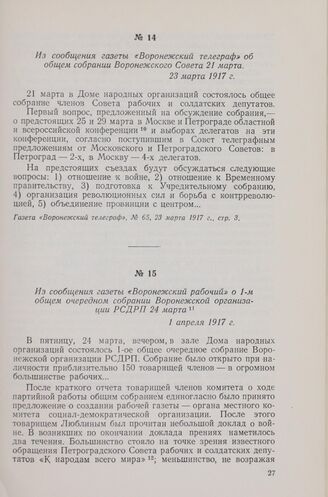 Из сообщения газеты «Воронежский телеграф» об общем собрании Воронежского Совета 21 марта. 23 марта 1917 г. // Газета «Воронежский телеграф», № 65, 23 марта 1917 г., стр. 3.