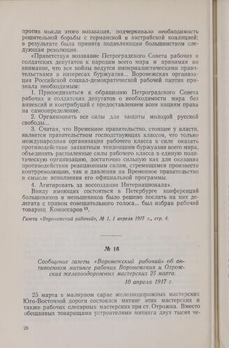 Сообщение газеты «Воронежский рабочий» об антивоенном митинге рабочих Воронежских и Отрожских железнодорожных мастерских 25 марта. 10 апреля 1917 г. // Газета «Воронежский рабочий», № 2, 10 апреля 1917 г., стр. 4.