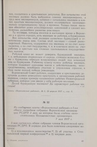 Из сообщения газеты «Воронежский рабочий» о 5-ом общем очередном собрании Воронежской организации РСДРП 3 мая, на котором была создана самостоятельная большевистская организация. 7 мая 1917 г. // Газета «Воронежский рабочий», № 7, 20 (7) мая 1917 г. стр. 2- 3.
