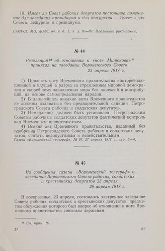 Резолюция об отношении к «ноте Милюкова» принятая на заседании Воронежского Совета. 23 апреля 1917 г. // Газета «Воронежский телеграф», № 87, 27 апреля 1917 г., стр. 3-4.