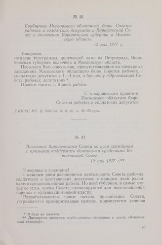 Сообщение Московского областного бюро Советов рабочих и солдатских депутатов в Воронежский Совет о включении Воронежской губернии в Московскую область. 12 мая 1917 г.